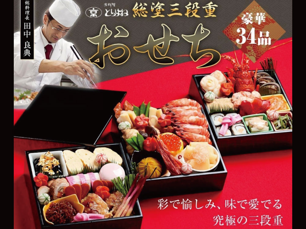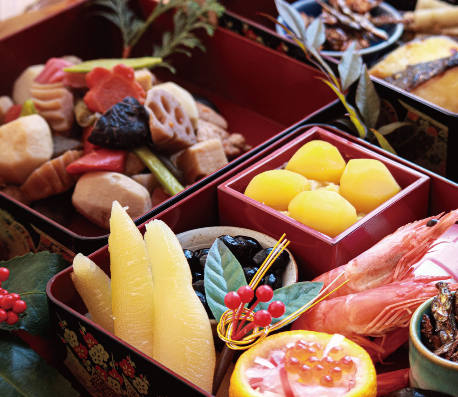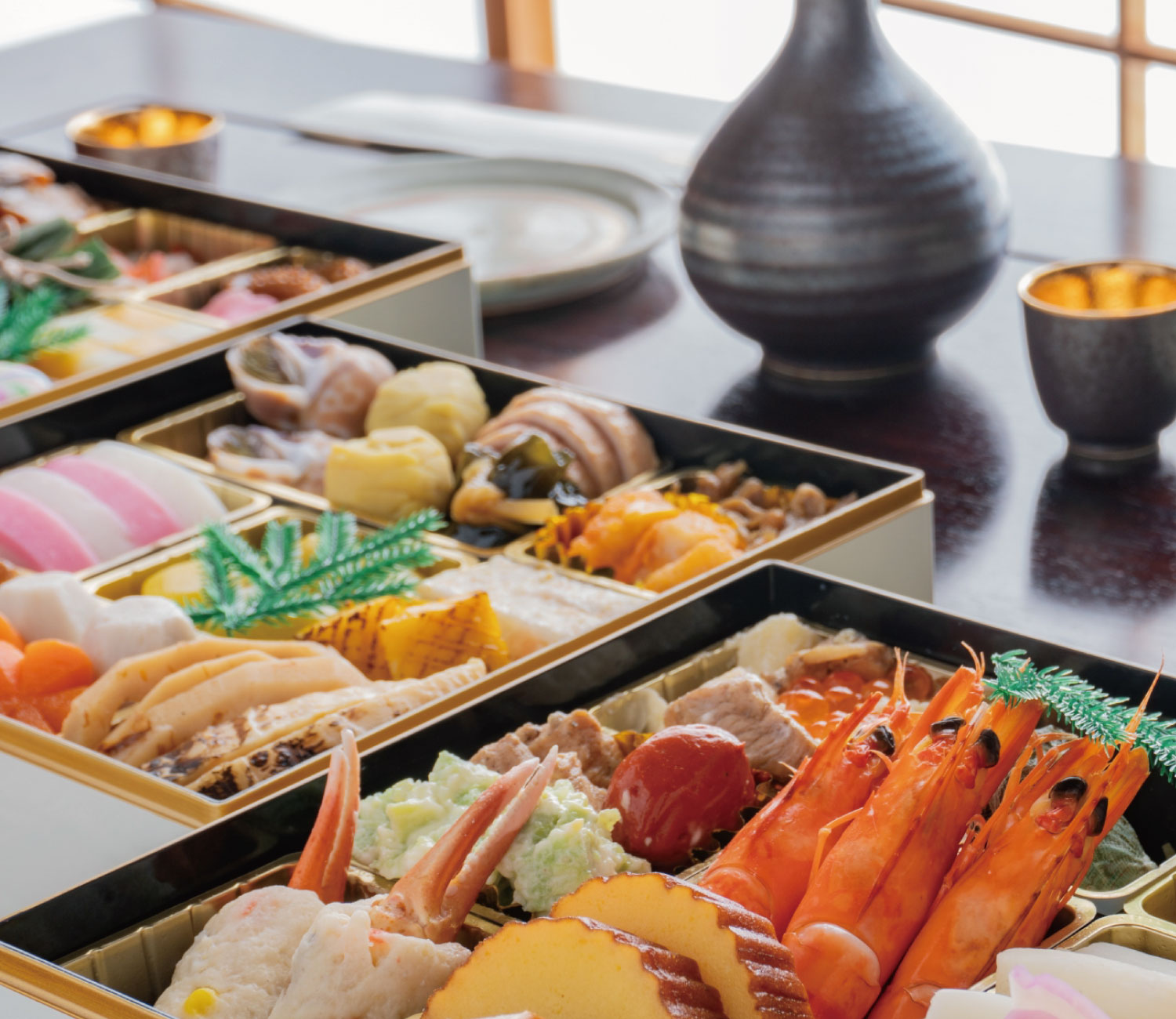 「総塗三段重」は、厳選した素材を使い、味わいの調和と芸術的な美しさに工夫した全34品を、漆黒の総塗三段重に華やかに盛り込みました。新年のハレの日にふさわしい伊勢海老、唐墨や河豚糠の珍味をはじめ、最上級の食材を取り入れた贅沢な味わいをご堪能ください。