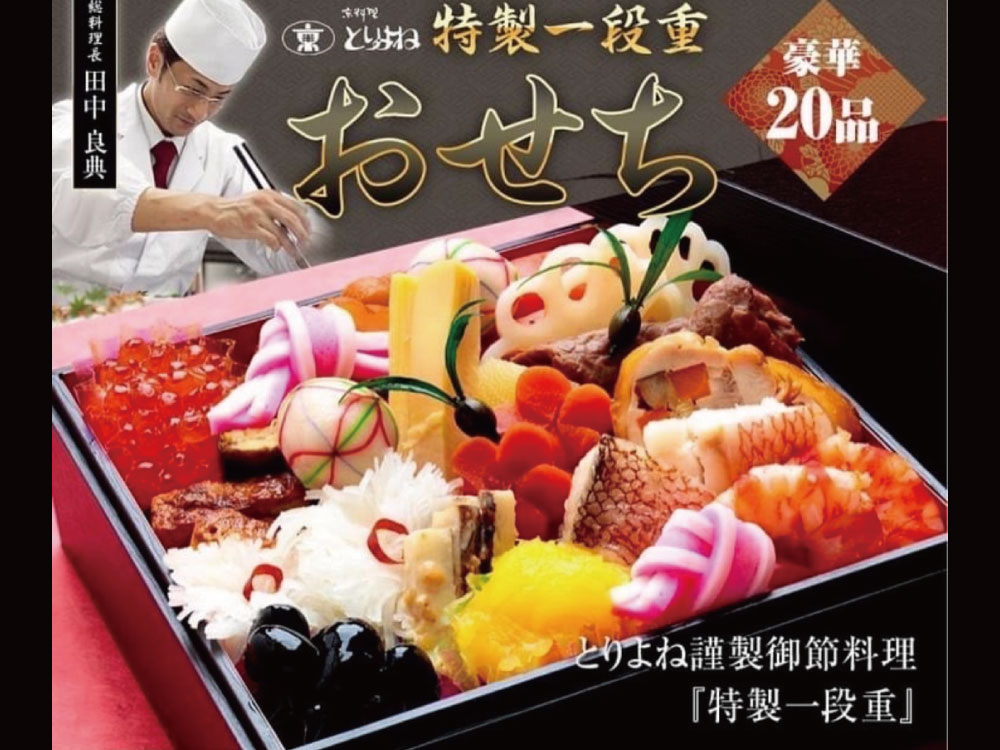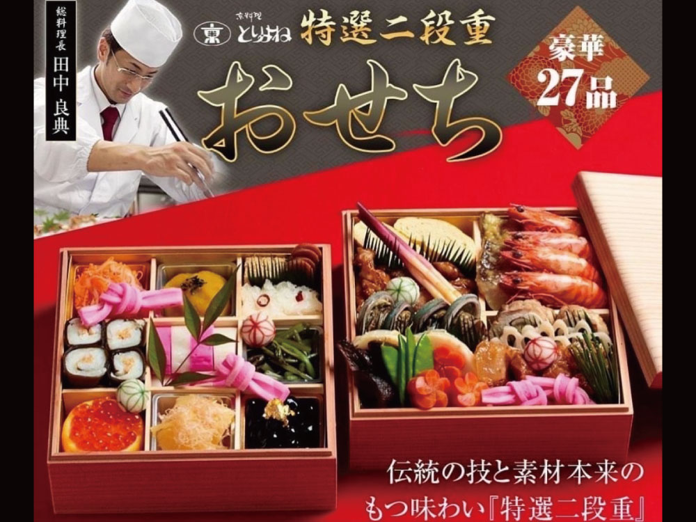 「特選桐箱二段重」は、オリジナル熟成鶏を使った自慢の鶏料理をはじめ、素材を吟味し手技を尽くした全27品を白木の二段重に彩り豊かに盛り込みました。熟練の料理人が真心を込めて作り上げる、京料理ならではの繊細な味わいをご堪能ください。