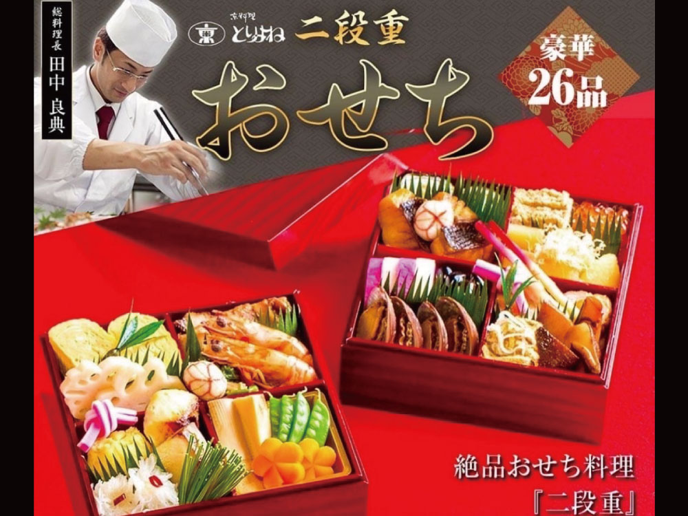「謹製二段重」は、オリジナル熟成鶏を使った自慢の鶏料理をはじめ、素材を吟味し手技を尽くした全26品を彩り豊かに盛り込みました。一つひとつ職人の手作りで真心を込めて作り上げる、京料理ならではの繊細な味わいをご堪能ください。