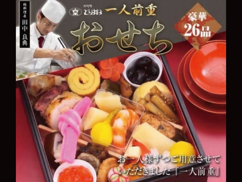 「謹製一人前重」は、お正月のご馳走を銘々にお召し上がりいただけるように一人前の献立に仕立てました。おせち料理に欠かせない縁起物から鴨ロース、サーモンチーズといった特別なお料理など、多彩な全26品を一段重に盛り込んでお届けいたします。
