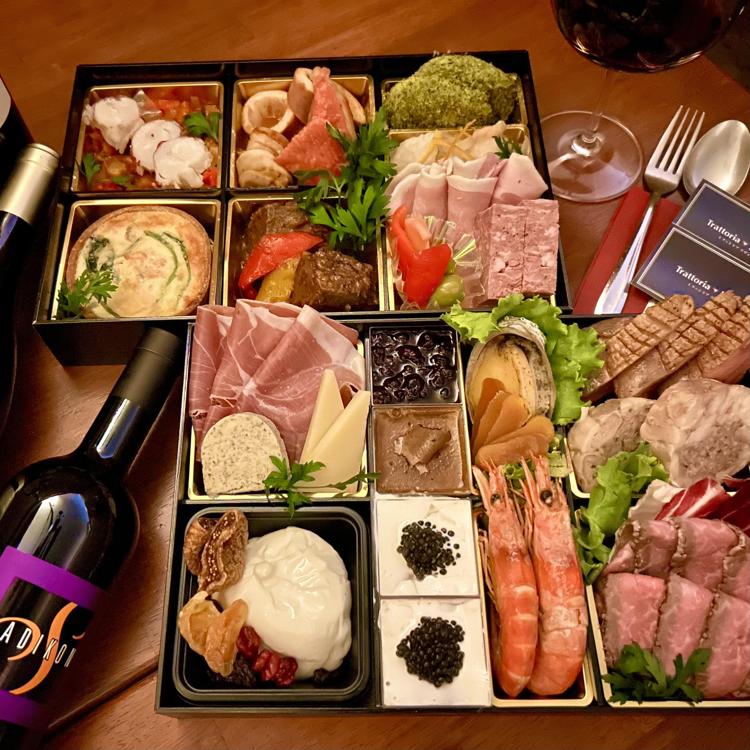 1.生ハムとパルミジャーノ トリュフバター添え 2.鮑のヴァポーレと自家製カラスミ、トリ ュフ入りポルチーニのムース、フォワグラのムースとアマレナチェリー 3.合鴨ロース肉低 温ロースト、若鶏のガランティーヌ 4.イタリア プーリア産ブッラータチーズとドライフル ーツ 5.沖縄県産 車エビのボッリート、パプリカのムースとキャビア、パプリカのムース とズワイガニのサラダ 6.名物 北海道産神内あか牛のローストビーフとケークサーレ 7. カポナータ・インヴェルノ(冬野菜のトマト煮込み)とオマール海老 8.金目鯛とホタテ、イ カのブイヤベース仕立て 9.寒鰤の香草パン粉焼き、鱈のカルピオーネ 柚子風味 10.スモ ークサーモンとほうれん草のキッシュ 11.国産あか牛すね肉の赤ワイン煮込み ストラコッ ト 12.国産豚のローストポークとパテ・ド・カンパーニュ オリーブとピクルス添え